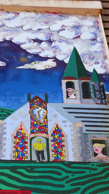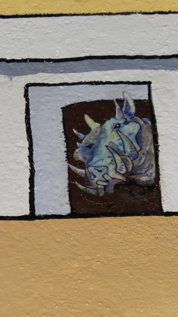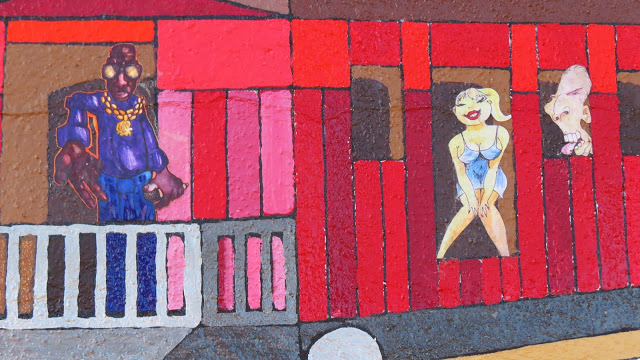 Characters hand done on paper with paint/markers/pens and applied using MTN Spray Adhesive with a MTN Varnish Matte coat for weatherproofing.
